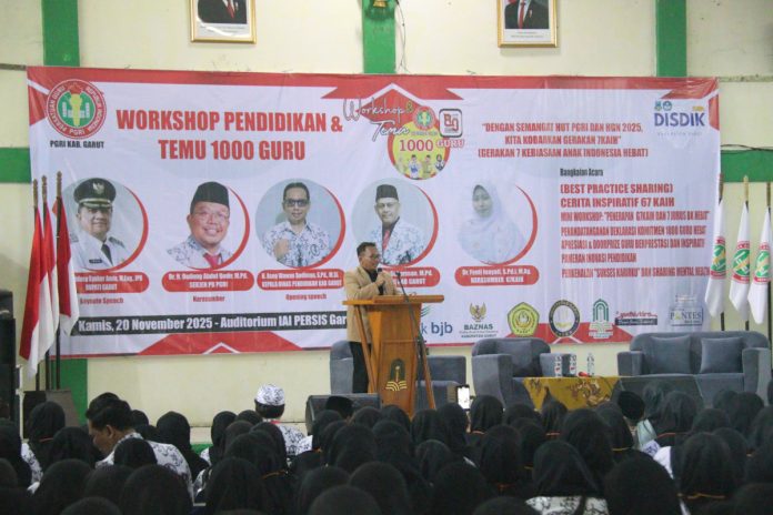 GARUT/Kalampriangan.com– Persatuan Guru Republik Indonesia (PGRI) Kabupaten Garut menyelenggarakan Workshop Pendidikan dan Temu 1000 Guru di Auditorium IAI Persis Garut, Kecamatan Tarogong Kidul, Kamis (20/11/2025). Kegiatan ini dihadiri sekitar 1.100 peserta dari berbagai kecamatan dan dibuka secara resmi oleh Kepala Dinas Pendidikan Kabupaten Garut, Asep Wawan Budiman.